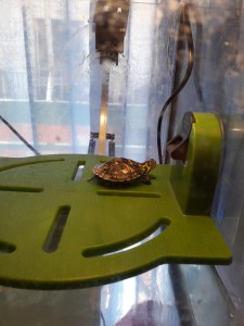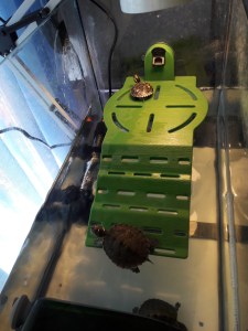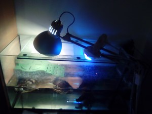 Μπορούμε να χρησιμοποιήσουμε ένα ενυδρείο για ψάρια ή να αγοράσουμε ένα ενυδρείο για χελώνες. Με ειδικά σποτ που μπορούμε να προμηθευτούμε από ένα κατάστημα ηλεκτρικών ειδών τοποθετούμε μία λάμπα με ακτίνες UVB και μία απλή λάμπα για την παροχή ζέστης στο σημείο που βγαίνει η χελώνα για να λιαστεί και να στεγνώσει.