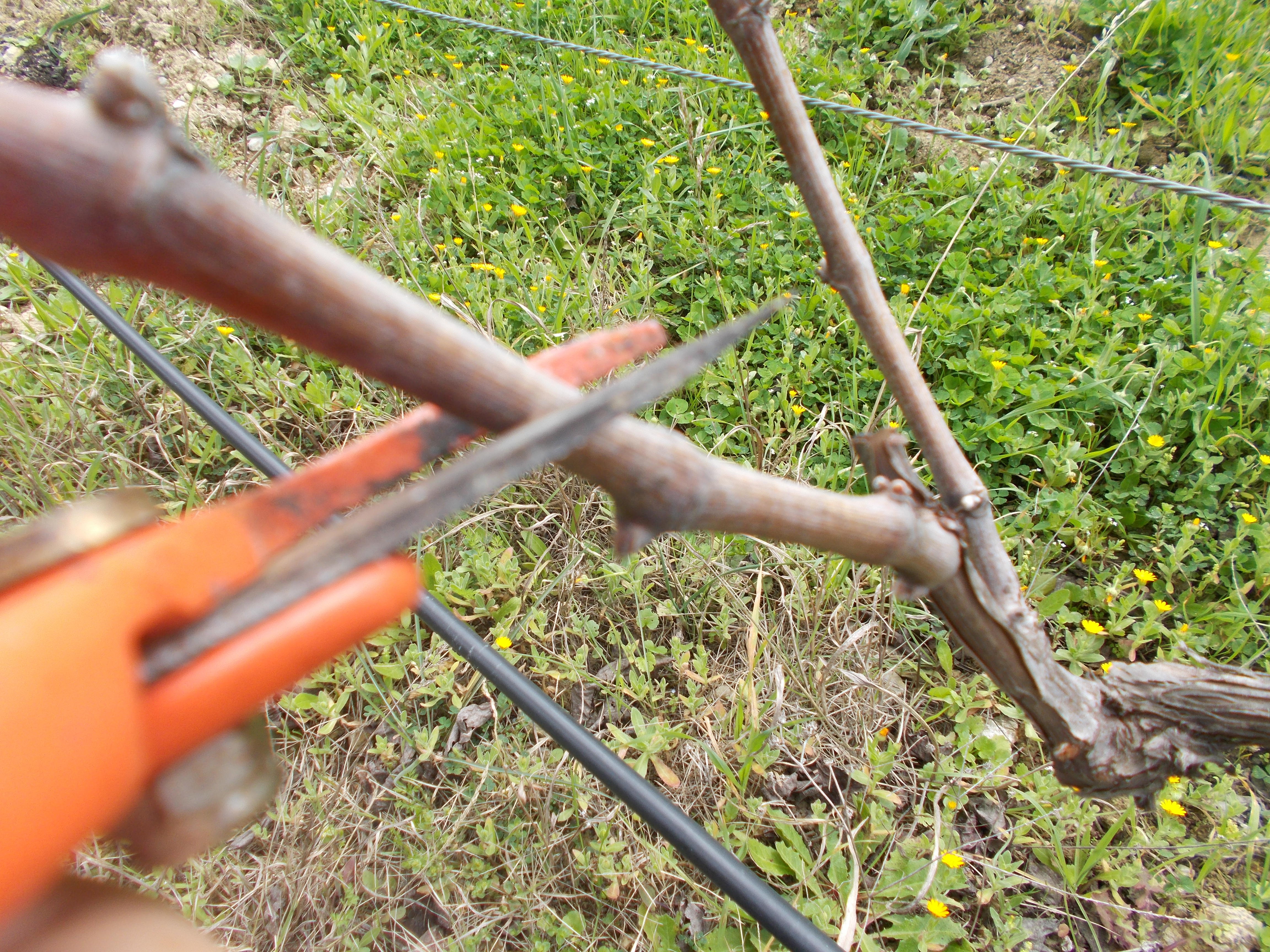 Στην συνέχεια σε κάθε κεφαλή (αναλόγως την εικόνα και την δύναμη της κάθε κεφαλής) αφήνονται από 1 έως 2 κληματίδες και κλαδεύονται στα 2 ή 3 το πολύ μάτια (αναλόγως την δύναμη των κληματίδων). Το κόψιμο με το κλαδευτήρι μας, πρέπει να είναι λοξό σε αντίθετη φορά από το μάτι. Πρέπει δηλαδή λίγο πιο πάνω από το μάτι να δημιουργείται μία κατηφόρα η οποία θα προστατεύει το μάτι από τα υγρά της εγκοπής και από τις βροχές. Ακολουθούν εικόνες από το κλάδεμα μίας κληματίδας πάνω από μάτι για να καταλάβετε την φορά εγκοπής: