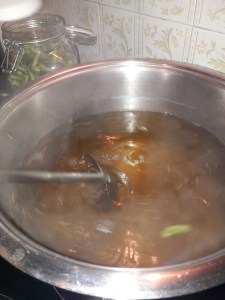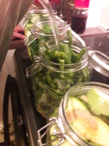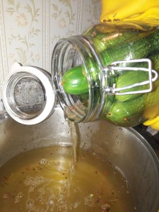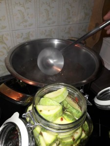 Στην συνέχεια αδειάζουμε για τελευταία φορά το νερό από τα βάζα στην κατσαρόλα και ξεκινάμε να φτιάξουμε την άλμη. Αφήνουμε το νερό να βράσει (το νερό πλέον έχει πάρει γεύση και αρώματα από τα λαχανικά και τα μπαχαρικά που είχαμε ρίξει στα βάζα) και στην συνέχεια ρίχνουμε το αλάτι και την ζάχαρη και ανακατεύουμε καλά μέχρι να λιώσουν.